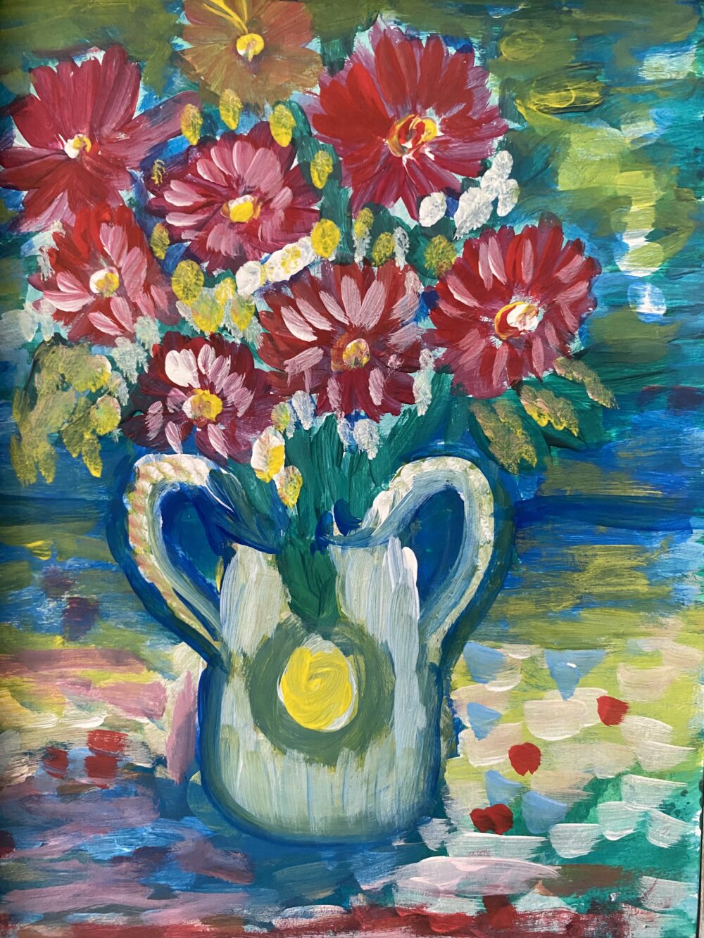 Ich wollte die Leichtigkeit und Wärme eines einfachen Moments festhalten – ein Strauß Blumen auf dem Tisch, ein Krug mit Geschichte.